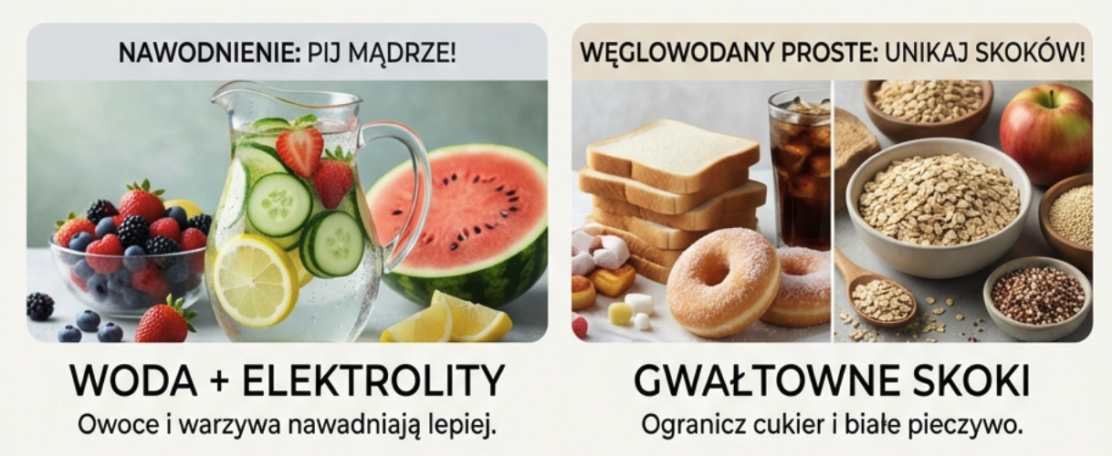 - Źle nawodniony organizm - już 1-2% odwodnienia obniża koncentrację i wydolność fizyczną. Owoce i warzywa nawadniają nawet o 200% skuteczniej niż sama woda, bo dostarczają elektrolity razem z płynami.