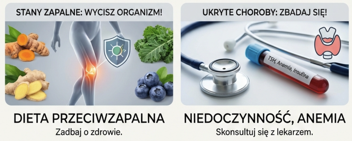 - Utajone stany zapalne - ciało w stanie przewlekłego zapalenia zużywa ogromne ilości energii na „walkę" z wewnętrznym wrogiem. Nie masz siły, bo Twój układ odpornościowy pracuje na pełnych obrotach - tylko że w złym kierunku.
