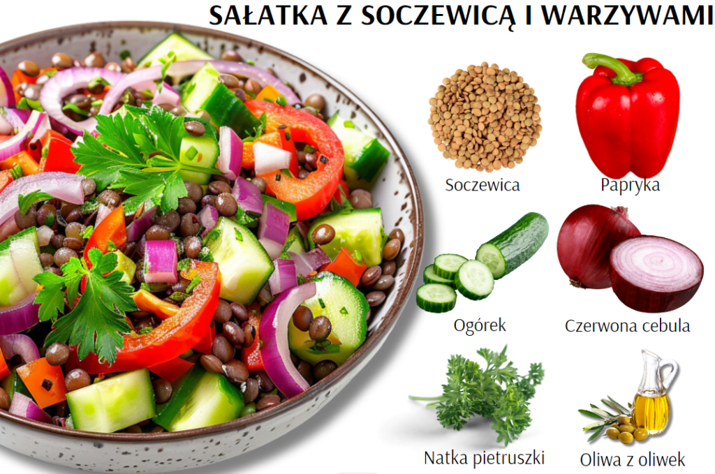 Szukasz zdrowej przekąski, która doda Ci energii na resztę dnia? Wypróbuj sałatkę z soczewicą i warzywami – szybka do przygotowania, pełna białka i witamin, idealna do zabrania do pracy.
