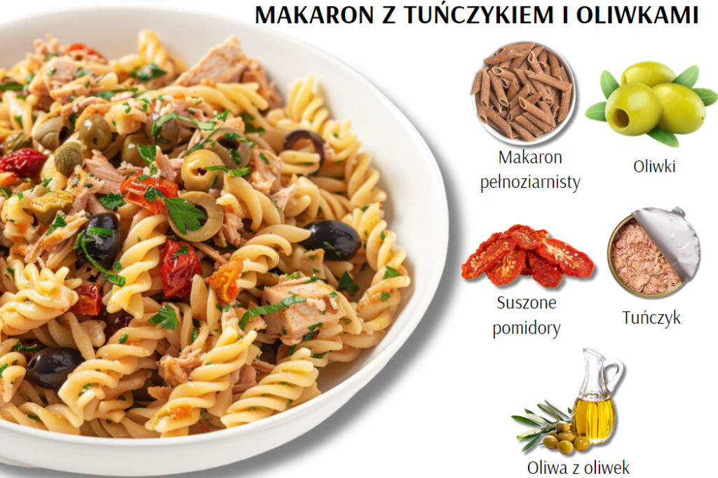 - Do miski z tuńczykiem dodaj ugotowany makaron, pokrojone oliwki, suszone pomidory i kapary.