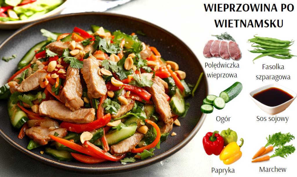 Wieprzowina po wietnamsku to danie pełne intensywnych smaków, które przeniesie Cię wprost do serca Azji. Delikatnie przyprawione mięso, marynowane w aromatycznej mieszance ziół i przypraw, idealnie komponuje się z lekką sałatką lub ryżem.