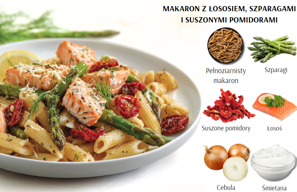 5.Makaron z łososiem, szparagami i suszonymi pomidorami
