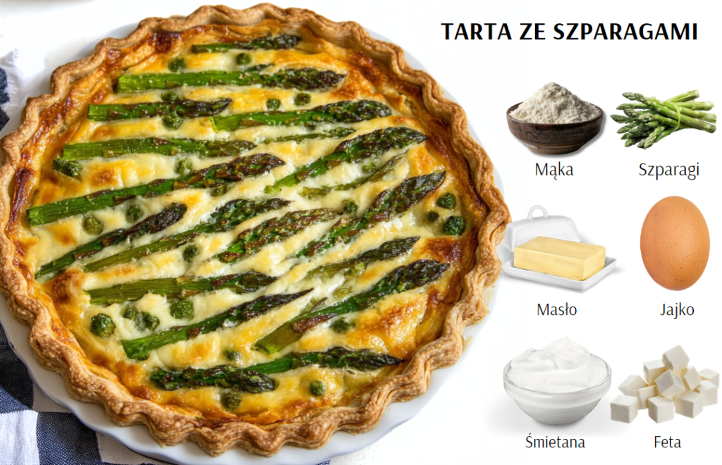- Na podpieczony spód wyłóż równomiernie kawałki szparagów.