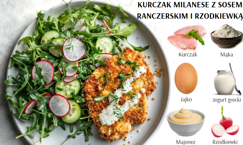 Kurczak Milanese z sosem ranczerskim i rzodkiewką to chrupiące i aromatyczne danie, które łączy klasyczną włoską panierkę z orzeźwiającym, kremowym sosem. Dodatek świeżej, chrupiącej rzodkiewki nadaje temu posiłkowi wyjątkowego charakteru i sprawia, że każda porcja smakuje wyjątkowo.