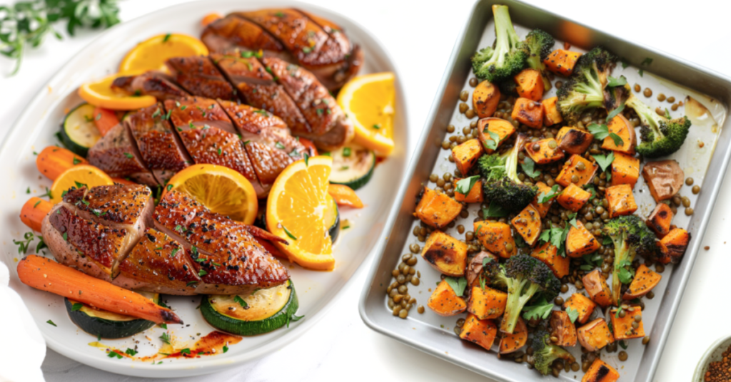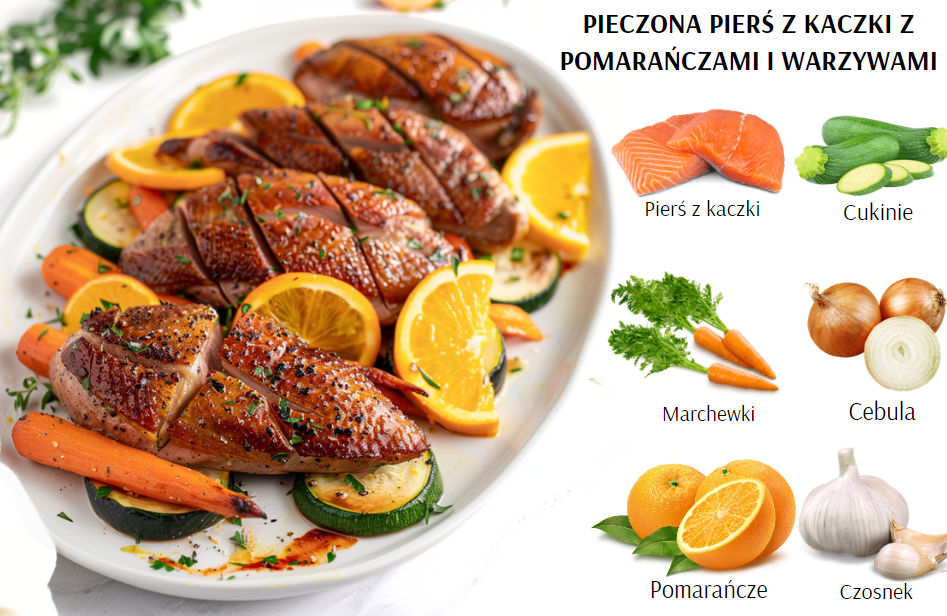 Pieczona pierś z kaczki z pomarańczami i warzywami to eleganckie danie, które łączy soczystość mięsa z orzeźwiającą słodyczą cytrusów. Aromatyczne warzywa dopełniają smak tej wykwintnej potrawy, czyniąc ją idealną propozycją na wyjątkowy obiad lub kolację.