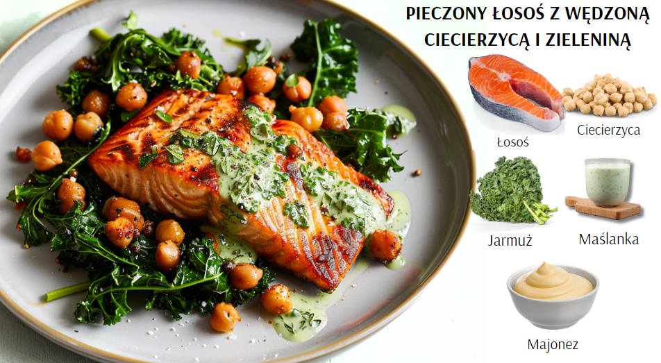 1.Pieczony łosoś z wędzoną ciecierzycą i zieleniną
