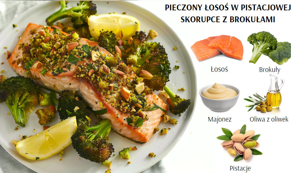 2.Pieczony łosoś w pistacjowej skorupce z brokułami