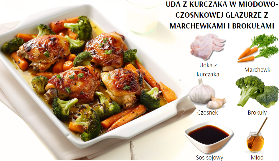 4.Uda z kurczaka w miodowo-czosnkowej glazurze z marchewkami i brokułami