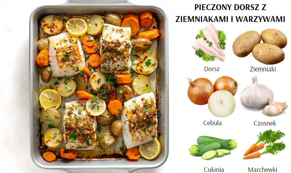 8.Pieczony dorsz z ziemniakami i warzywami