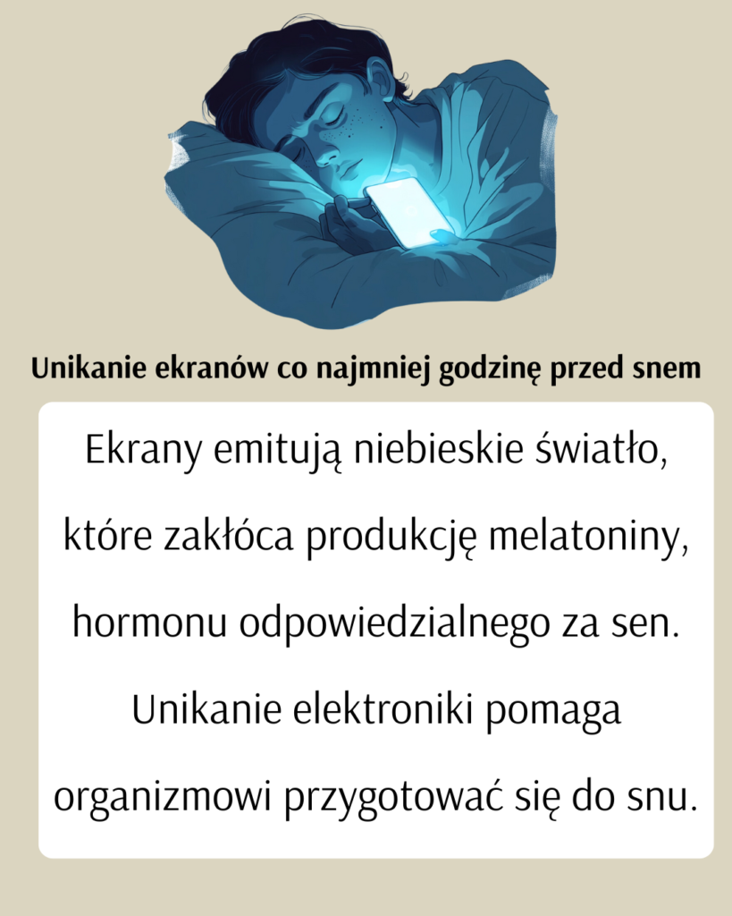 Ekrany urządzeń emitują niebieskie światło, które zakłóca produkcję melatoniny – hormonu odpowiedzialnego za sen. Odłożenie telefonu lub komputera na godzinę przed snem pozwala organizmowi przygotować się do nocnego odpoczynku.