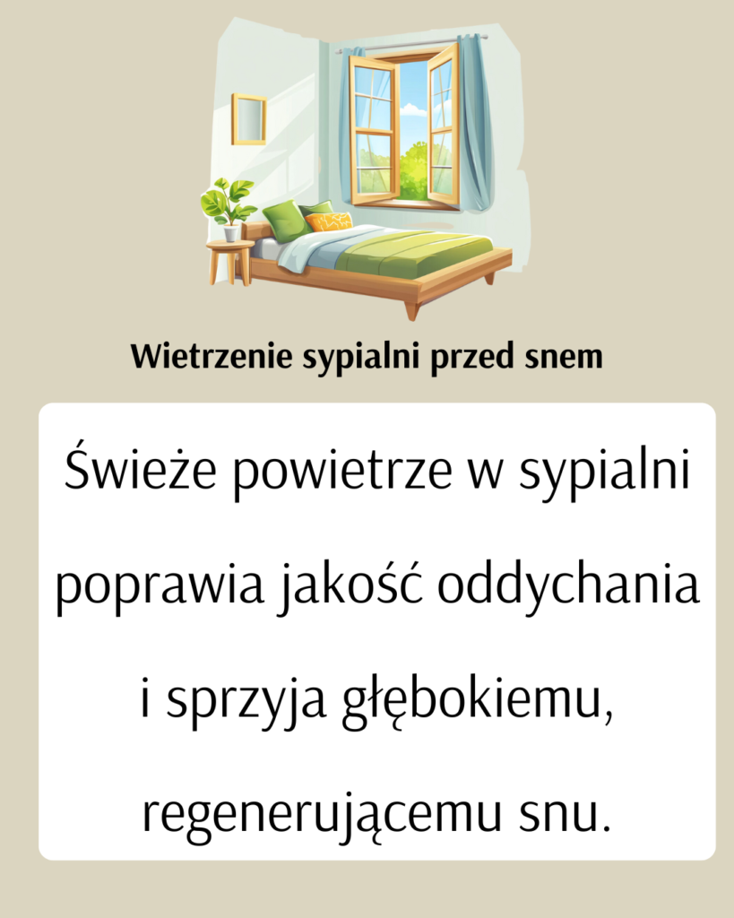 Świeże powietrze poprawia jakość oddychania i sprzyja regenerującemu snu. Nawet kilka minut wietrzenia przed pójściem spać może zrobić różnicę.