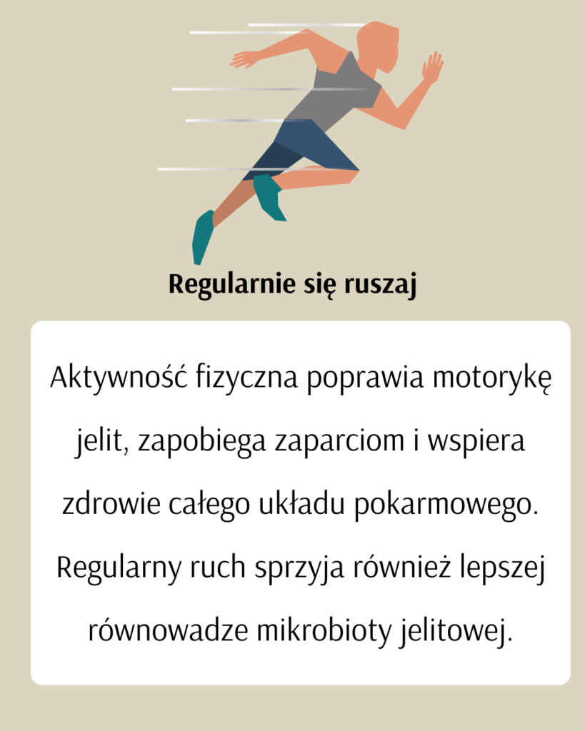 Ruch fizyczny poprawia motorykę jelit i sprzyja lepszemu funkcjonowaniu całego układu pokarmowego. Aktywność taka jak spacery, joga czy jazda na rowerze może przynieść zauważalne efekty.