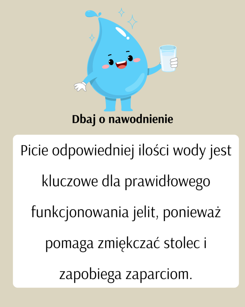 Odpowiednia ilość wody w diecie pomaga zmiękczyć stolec, co ułatwia regularne wypróżnienia i zapobiega zaparciom. Zaleca się picie co najmniej 1,5-2 litrów wody dziennie, a w upalne dni lub przy zwiększonym wysiłku fizycznym – nawet więcej.