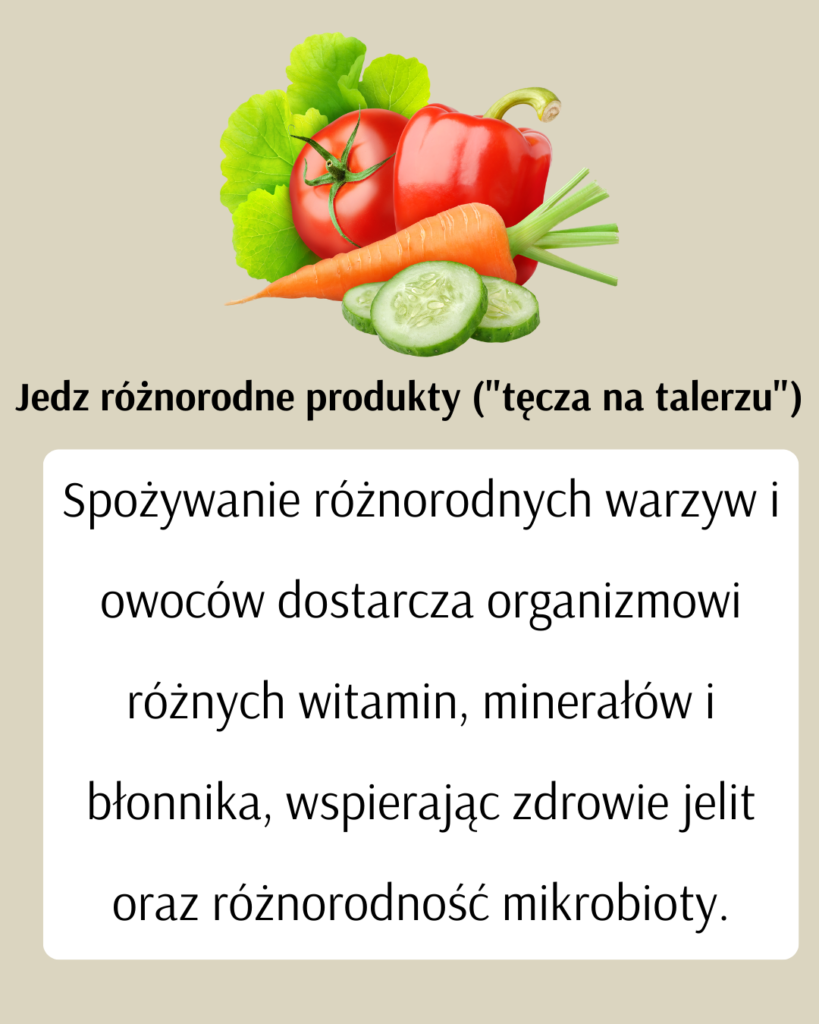 Kolorowe warzywa i owoce („tęcza na talerzu”) dostarczają różnorodnych składników odżywczych, które wspierają zdrowie jelit. Im bardziej różnorodna dieta, tym większe bogactwo mikroflory jelitowej.