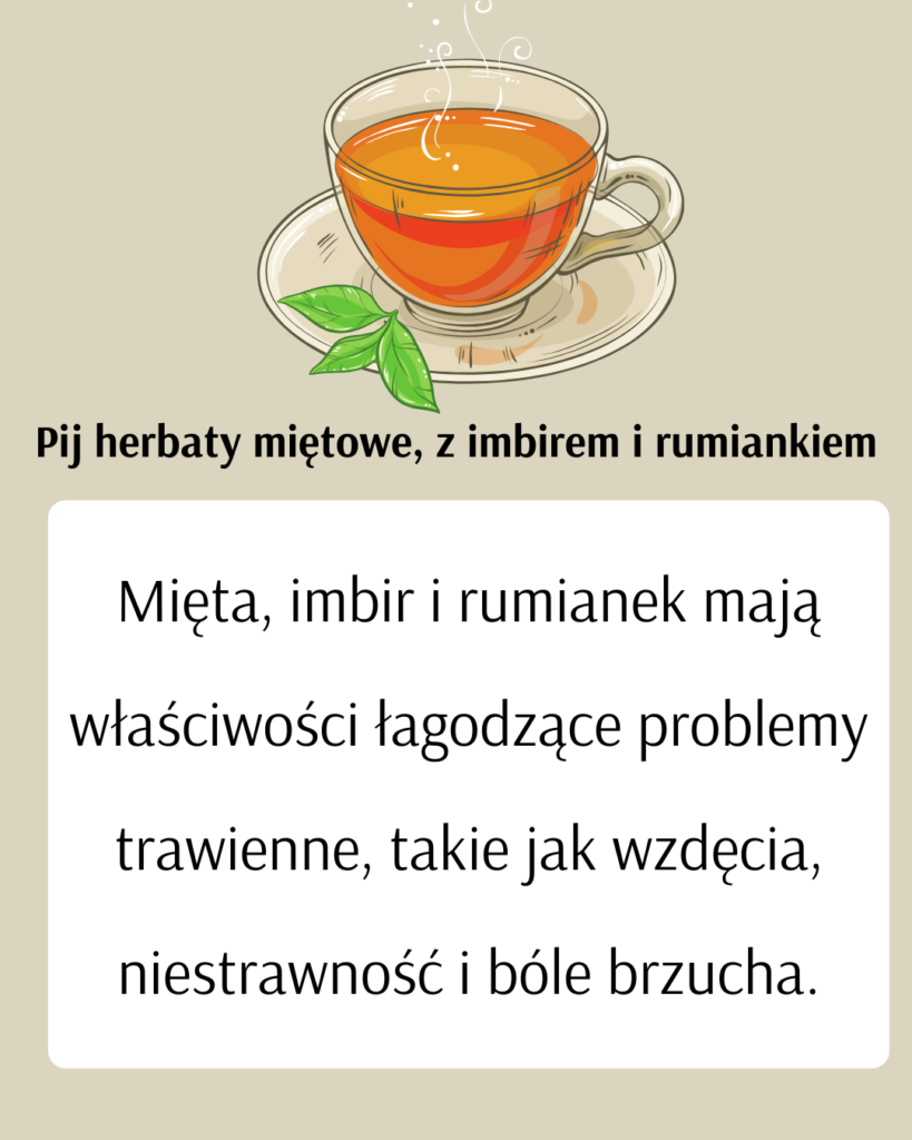 Te naturalne napary mają właściwości łagodzące, które pomagają przy wzdęciach, niestrawności i bólach brzucha. Herbata z rumiankiem działa również uspokajająco, co może pomóc w redukcji stresu, który negatywnie wpływa na jelita.