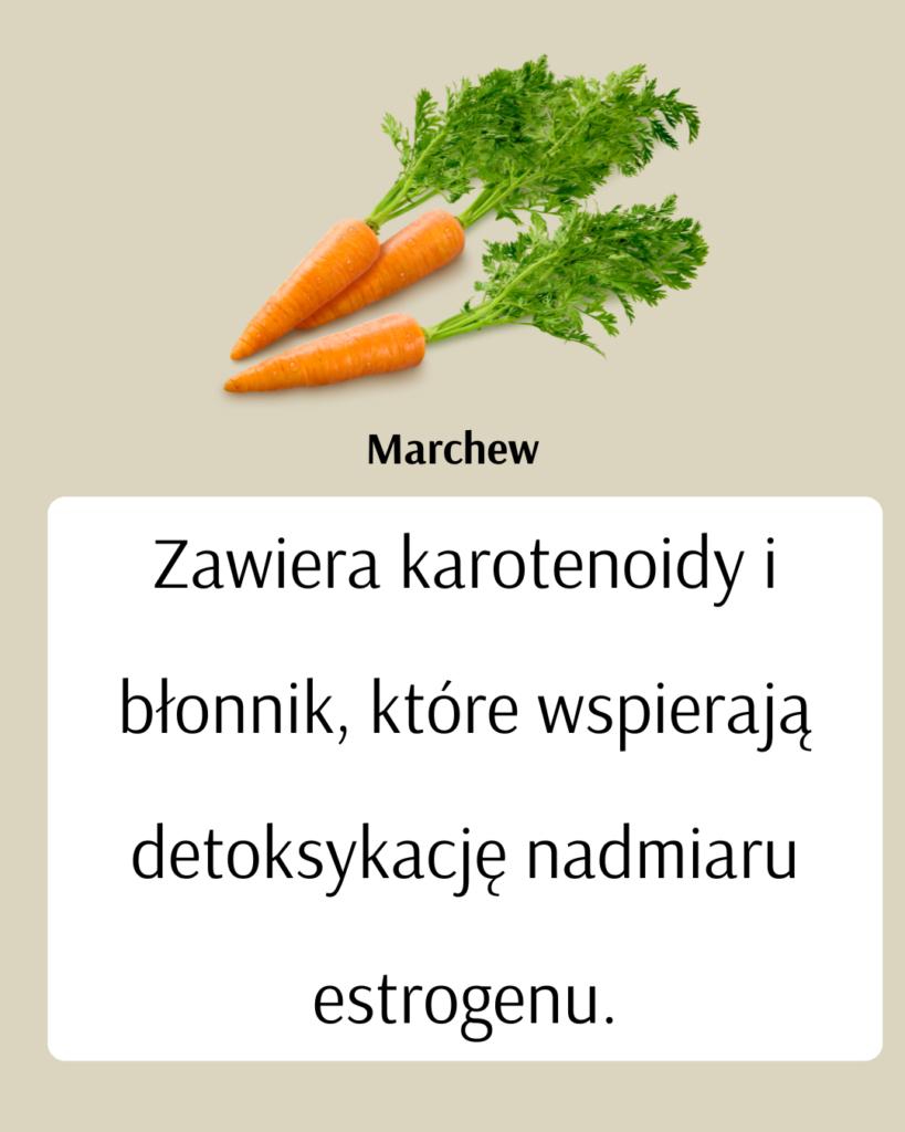 Marchew – Bogata w błonnik i karotenoidy wspiera detoksykację nadmiaru estrogenu. Regularne spożycie surowej marchewki to prosty sposób na zdrową równowagę hormonalną.