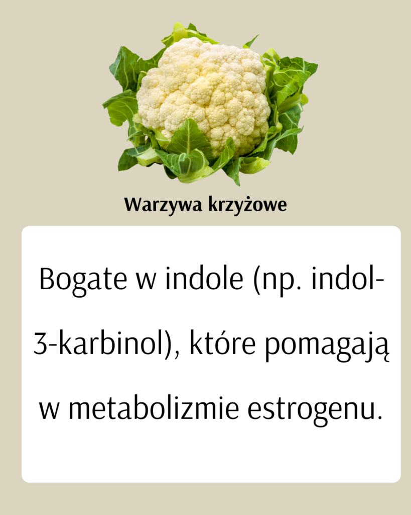 Warzywa krzyżowe – Kalafior, brokuły czy brukselka zawierają indole, wspierające metabolizm estrogenów i zapobiegające ich nadmiarowi.