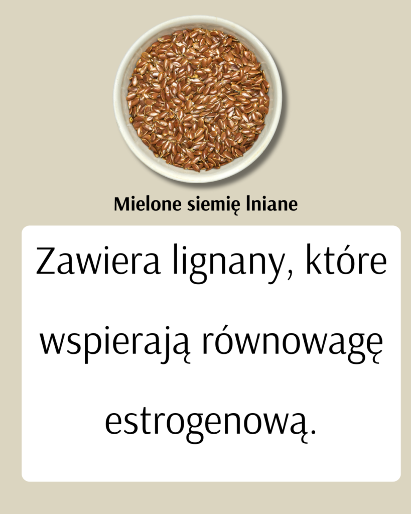 Mielone siemię lniane – Bogate w lignany, które działają jako fitoestrogeny, wspierając równowagę hormonalną. Dodaj je do jogurtu lub owsianki.