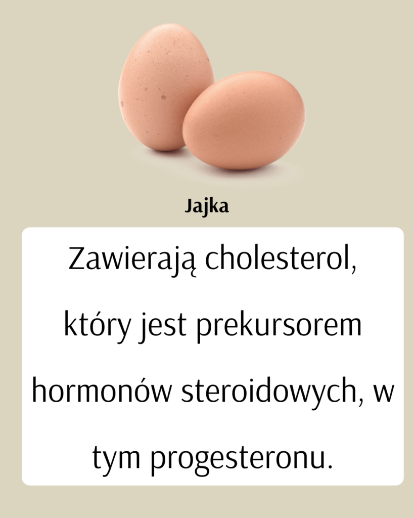 Jajka – Zawierają cholesterol, który jest prekursorem hormonów steroidowych, w tym progesteronu. Wybieraj jajka z chowu wolnowybiegowego dla lepszej jakości składników odżywczych.