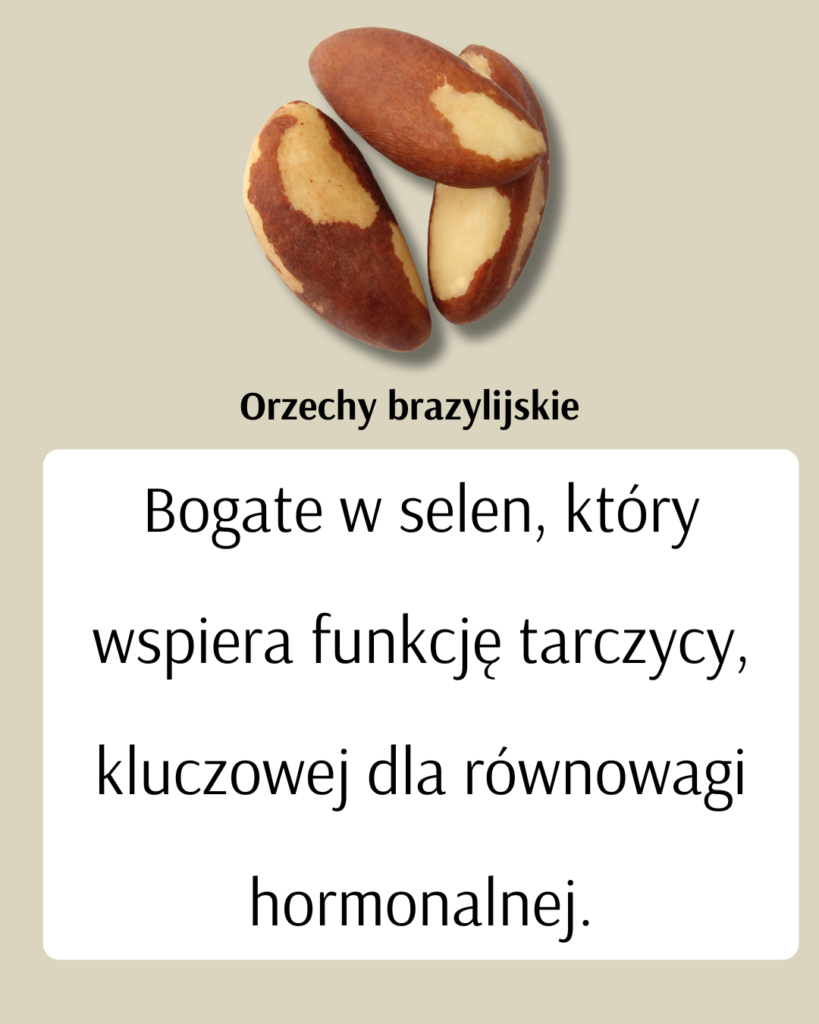 Orzechy brazylijskie – Bogate w selen, wspierający zdrowie tarczycy, która jest kluczowa dla prawidłowej równowagi hormonalnej.