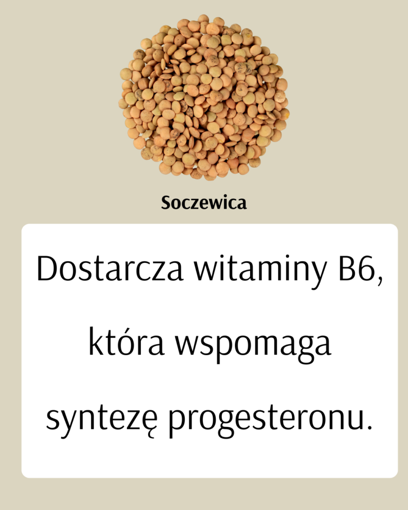 Soczewica – Dostarcza witaminę B6 wspierającą syntezę progesteronu. Świetna baza do zup czy sałatek.