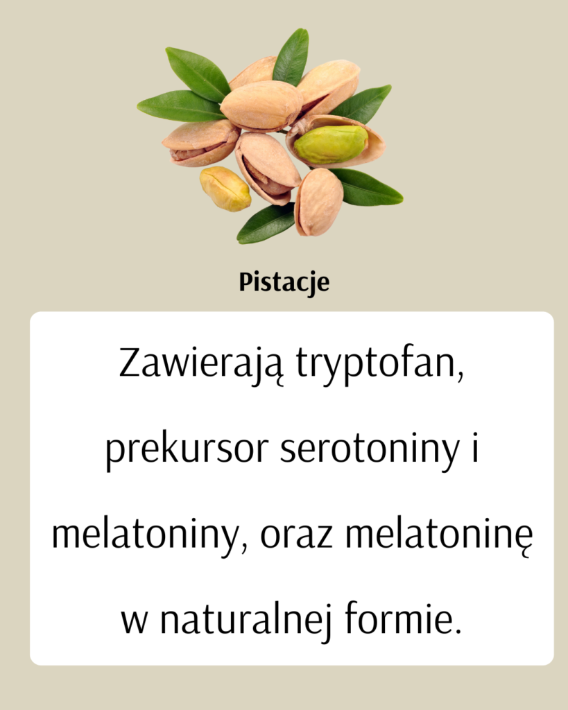 Pistacje – Zawierają tryptofan, prekursor melatoniny i serotoniny, oraz melatoninę w naturalnej formie. Świetnie sprawdzą się jako zdrowa przekąska na wieczór.