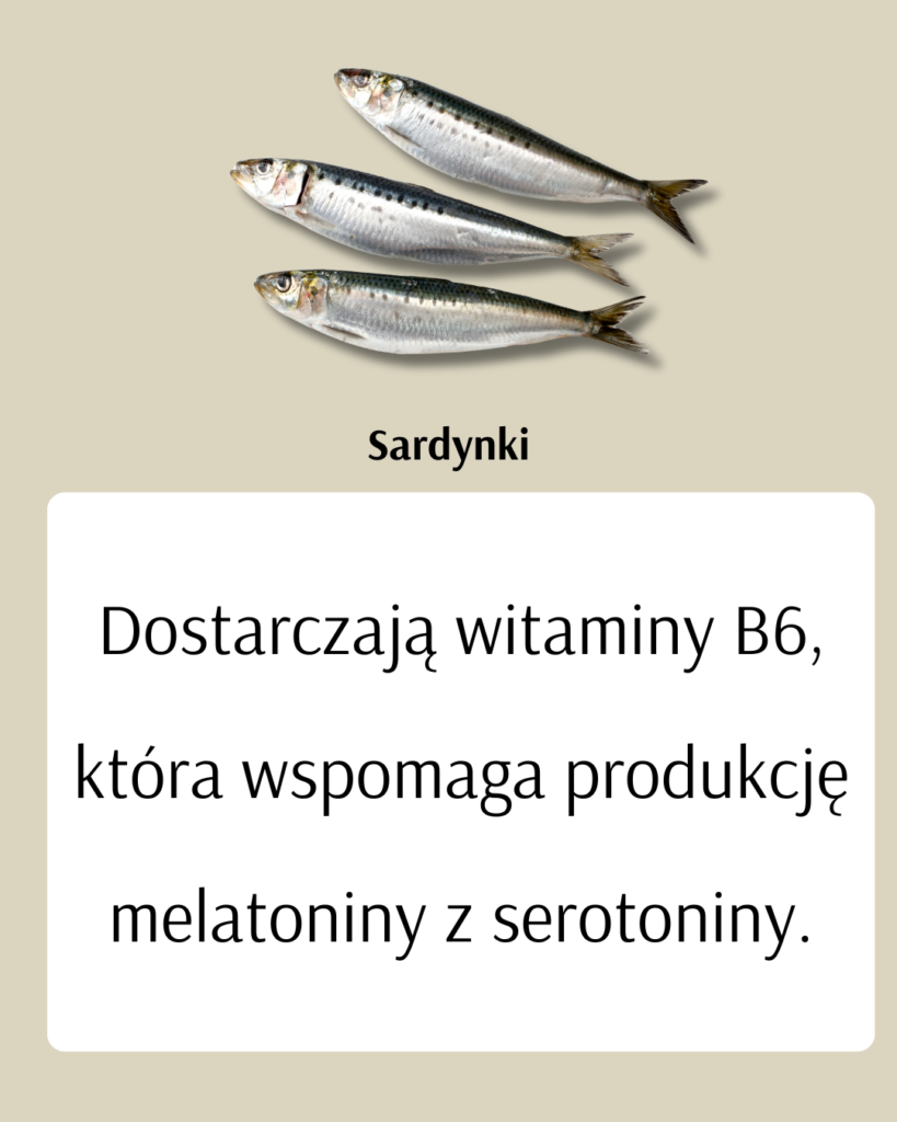 Sardynki – Dostarczają witaminę B6, która wspomaga przekształcanie serotoniny w melatoninę, wspierając spokojny sen.