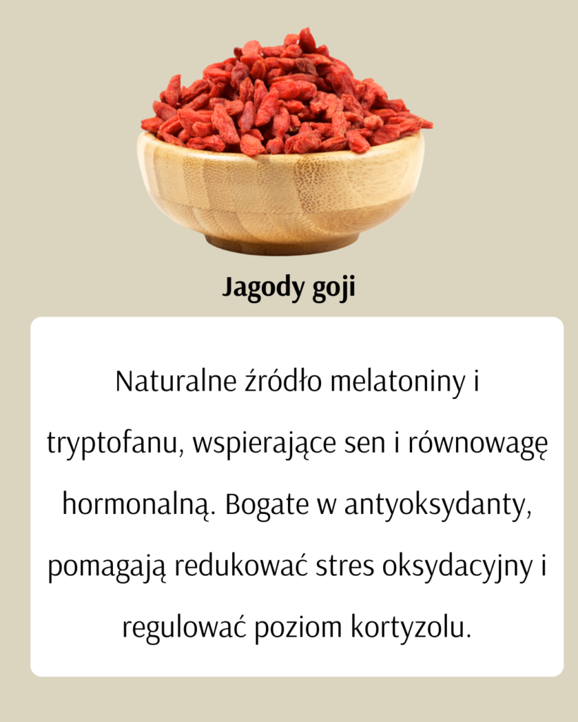 Jagody goji – To naturalne źródło melatoniny i antyoksydantów, które nie tylko pomagają w regulacji snu, ale również obniżają poziom stresu oksydacyjnego.