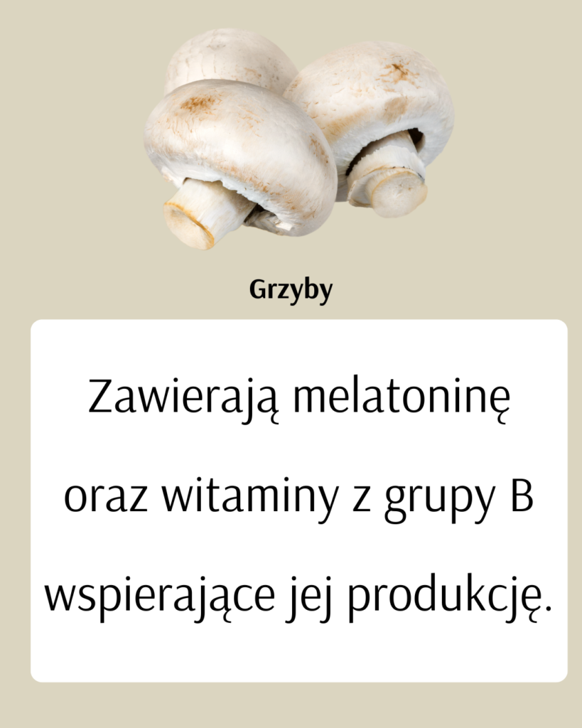 Grzyby – Zawierają melatoninę i witaminy z grupy B, wspierające jej produkcję. Dodawanie ich do zup czy sosów może przynieść korzyści zdrowotne.