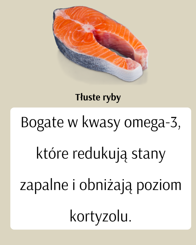 Tłuste ryby – Bogate w kwasy omega-3, które redukują stany zapalne i obniżają poziom kortyzolu. Regularne spożywanie łososia czy makreli wspiera zdrowie serca i układu nerwowego.