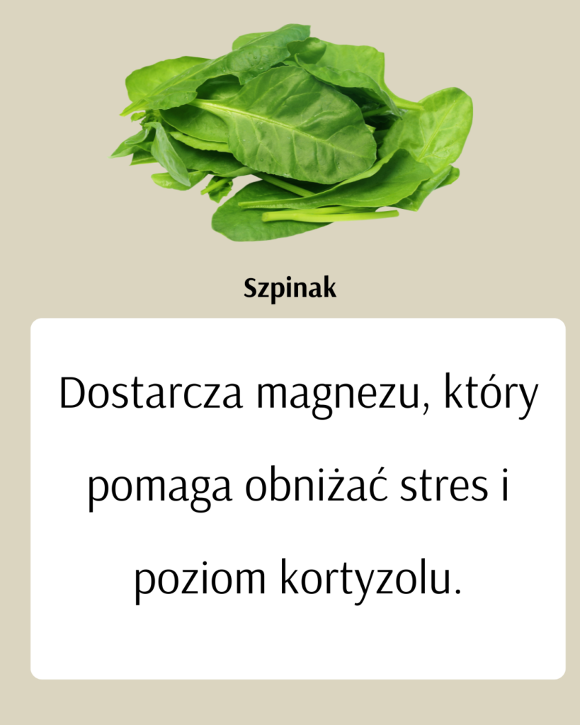 Szpinak – Źródło magnezu, który pomaga obniżać poziom kortyzolu i redukuje napięcie mięśniowe. Doskonały dodatek do sałatek lub smoothie.