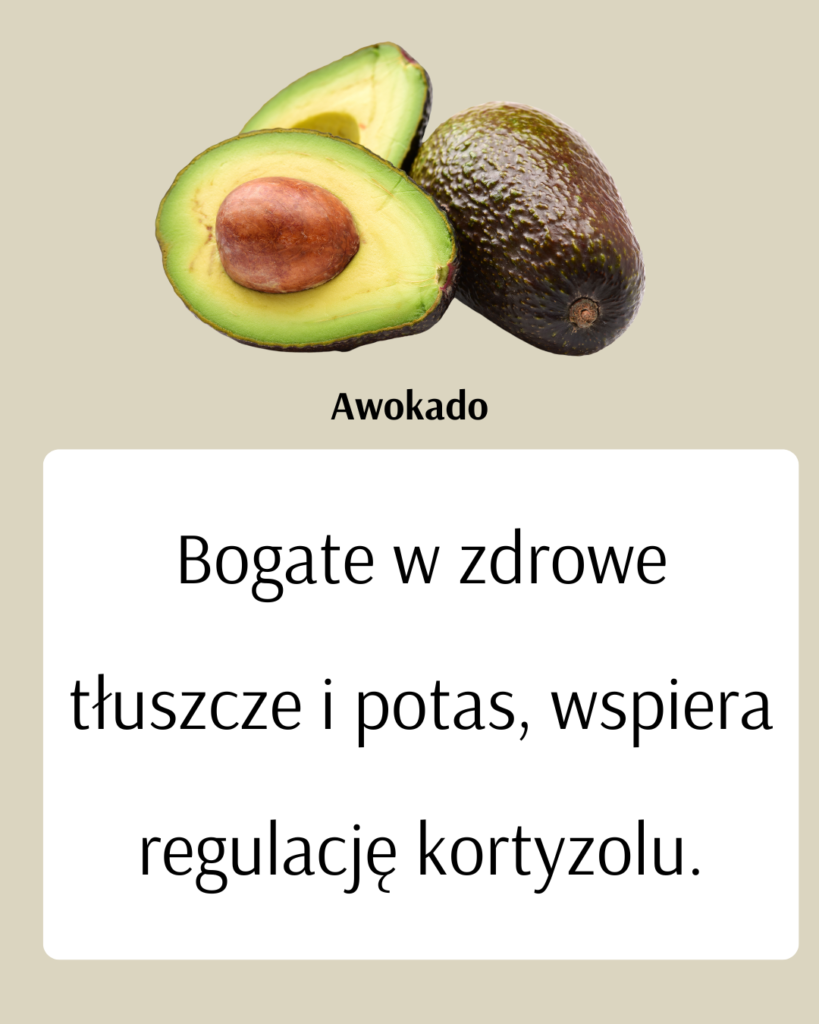Awokado – Zawiera zdrowe tłuszcze i potas, które wspierają regulację kortyzolu i poprawiają równowagę elektrolitową.