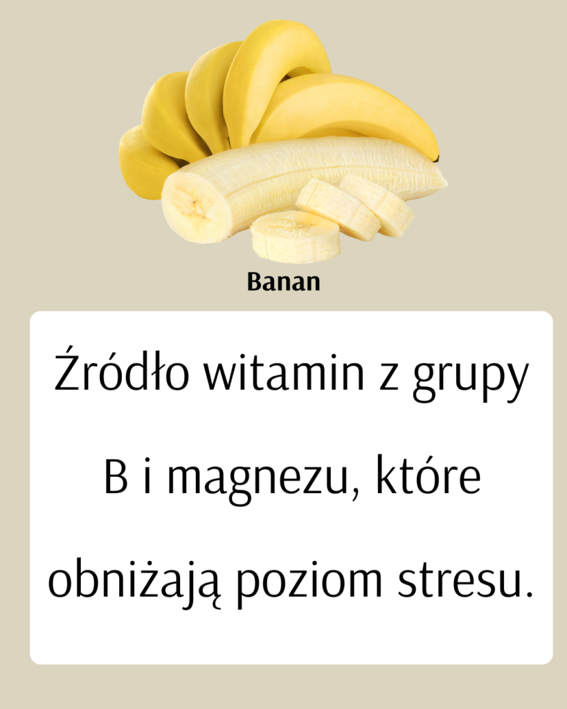 Banan – Dzięki zawartości magnezu i witamin z grupy B pomaga redukować napięcie nerwowe i poprawia nastrój.
