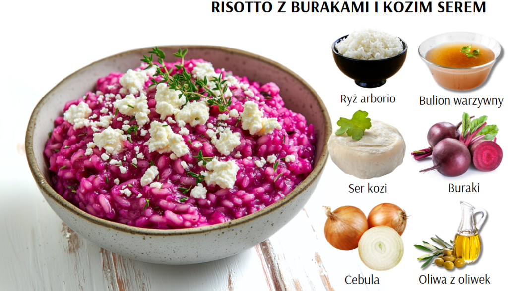 Kremowe risotto z burakami i kozim serem to wyjątkowe połączenie wyrazistych smaków i pięknych kolorów, które zachwyci każdego miłośnika dobrego jedzenia. Delikatna słodycz buraków idealnie komponuje się z kremową konsystencją ryżu i charakterystycznym aromatem koziego sera.