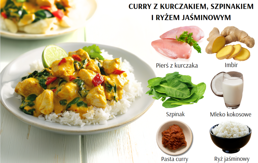 - Na talerzu ułóż porcję ryżu jaśminowego i polej go curry z kurczakiem i szpinakiem. Możesz udekorować dodatkową kolendrą i plasterkiem limonki.