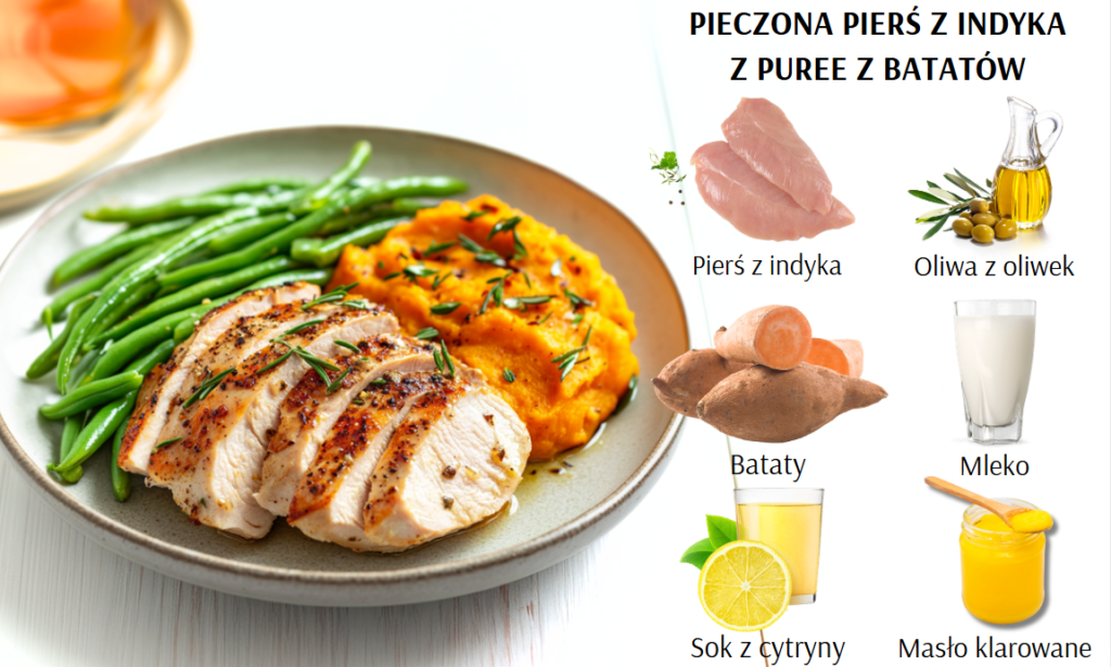 Pieczona pierś z indyka z aksamitnym puree z batatów to połączenie zdrowia i elegancji na talerzu. Delikatne, soczyste mięso i słodka, kremowa tekstura batatów tworzą idealny balans smaków, który sprawdzi się zarówno na codzienny obiad, jak i uroczysty posiłek.