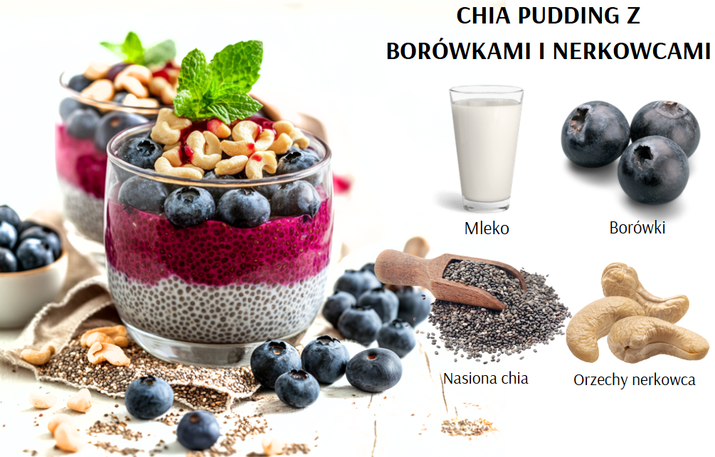 Chia pudding z borówkami i nerkowcami to lekka i pożywna propozycja na śniadanie lub zdrową przekąskę. Kremowa konsystencja, świeżość owoców i chrupkość orzechów tworzą harmonijne połączenie, które zachwyci każdego miłośnika prostych, a jednocześnie wyjątkowych smaków!