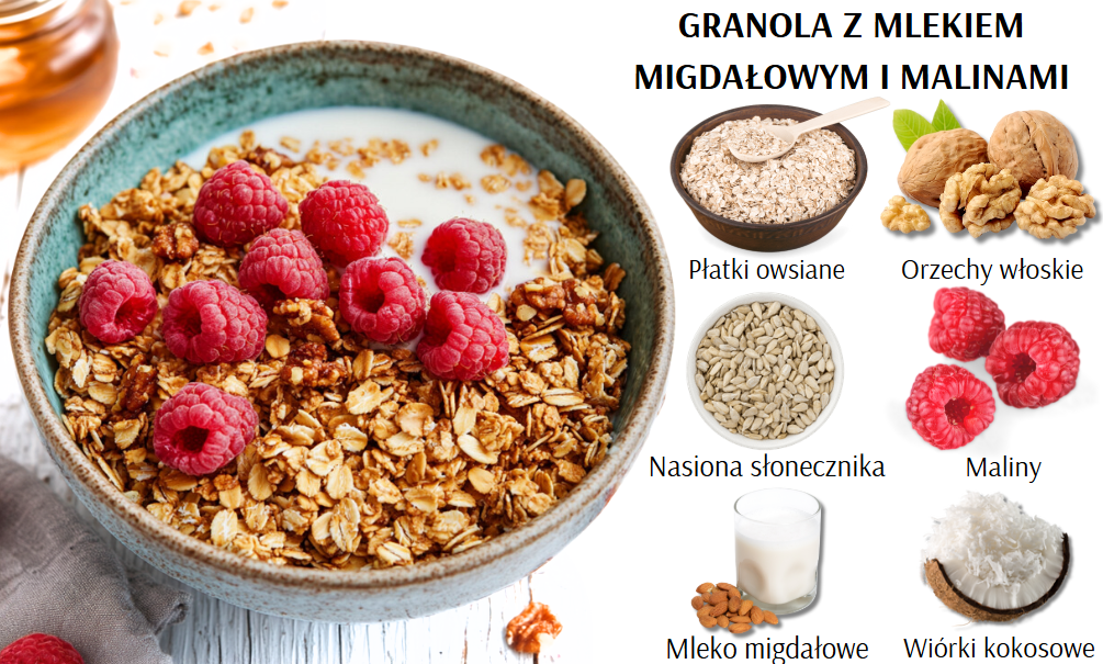 Granola z mlekiem migdałowym i malinami to chrupiąca i lekka propozycja na śniadanie pełne naturalnych smaków. Połączenie złocistej granoli, kremowego mleka roślinnego i soczystych owoców to gwarancja energii i przyjemności już od pierwszego kęsa!